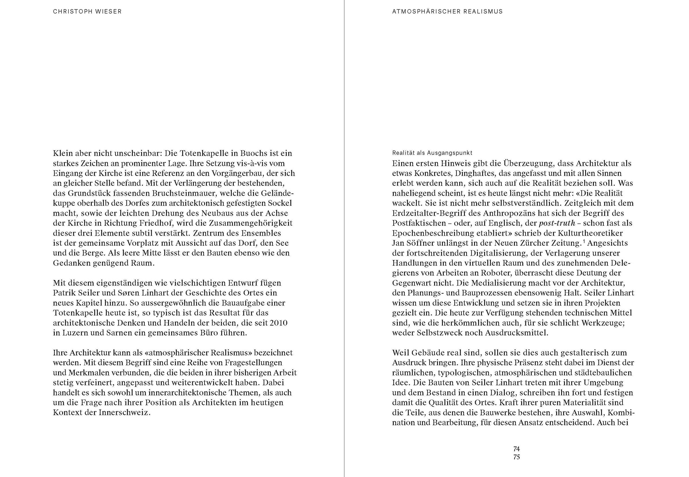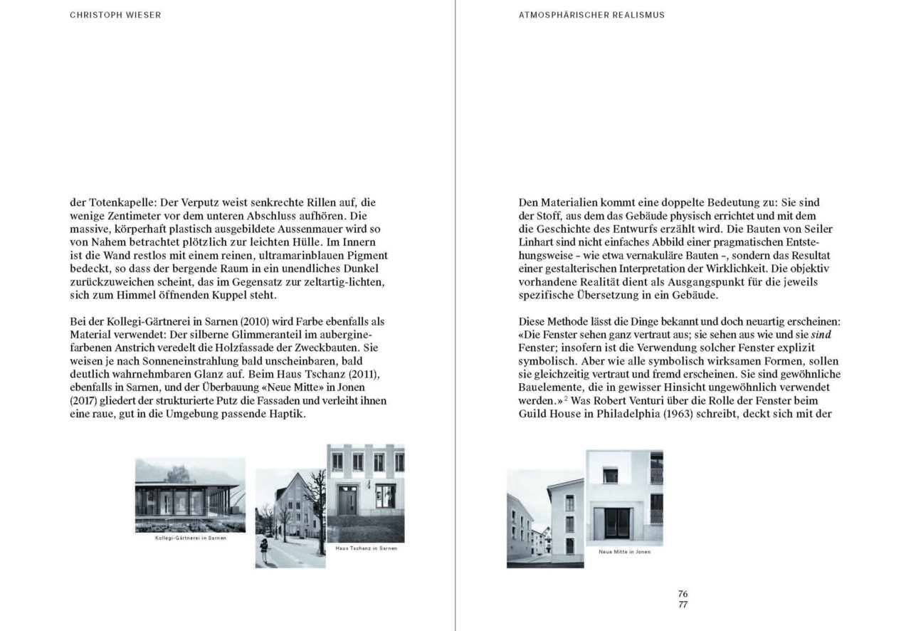 Der Text stellt die Totenkapelle in Buochs in den Kontext des bisherigen Werks von Seiler Linhart Architekten, die in Luzern und Sarnen ein Büro führen. Das Kleinod steht exemplarisch für ihre architektonische Haltung.