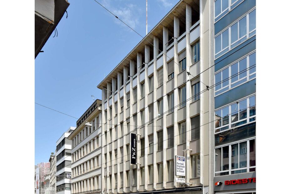 Das ehemalige Geschäftshaus Feldpausch im Zentrum von Basel aus dem Jahr 1956 verkörpert mit seiner eleganten Natursteinfassade und den filigranen Metallfenstern südländische Baukultur.