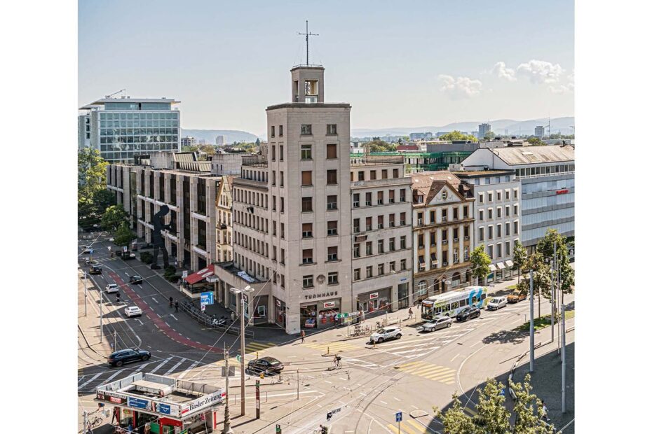 Das Turmhaus am Aeschenplatz von 1929 war das erste Hochhaus der Stadt Basel und das höchste Wohn- und Geschäftshaus der Schweiz. Bis heute ist es das prägnanteste Gebäude am Platz.