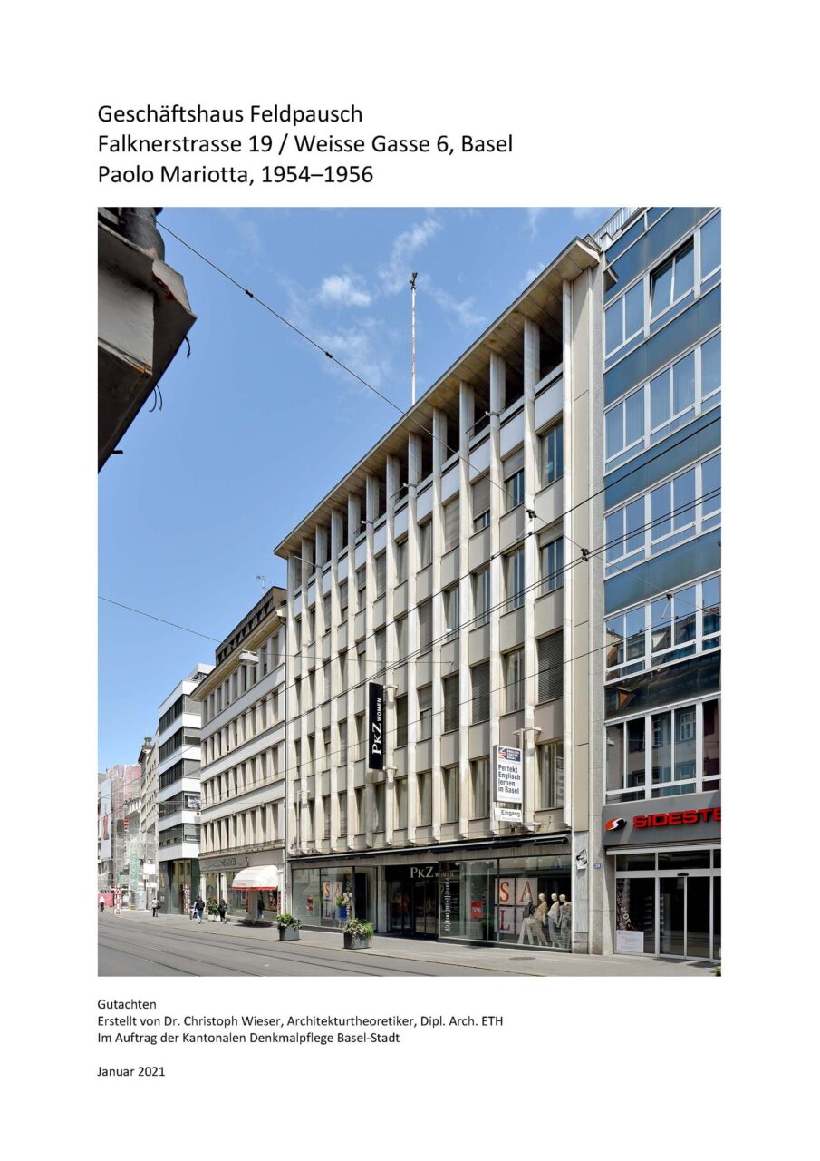 Das ehemalige Geschäftshaus Feldpausch im Zentrum von Basel aus dem Jahr 1956 verkörpert mit seiner eleganten Natursteinfassade und den filigranen Metallfenstern südländische Baukultur.